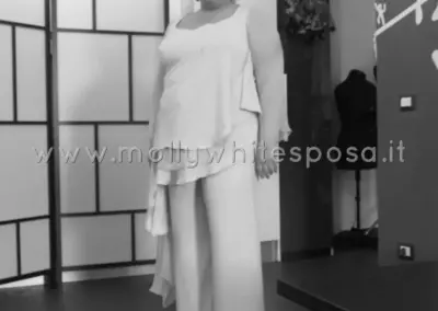 Grazie Roberta! La sfida era ingaggiante: un tessuto leggerissimo, morbido, sottile per realizzare un abito da sposa, ma soprattutto un pantalone che rendesse giustizia alle forme ma soprattutto al carattere dolce e tutto pepe di questa sposa che mi è rimasta nel cuore nonostante gli anni trascorsi dal suo matrimonio. Con un attento studio delle proporzioni, è stato bello trovare una soluzione comoda e leggera che le ha permesso di esprimersi al meglio durante il suo giorno più bello. Curvy è bello, pantalone è bello, insieme è magia!